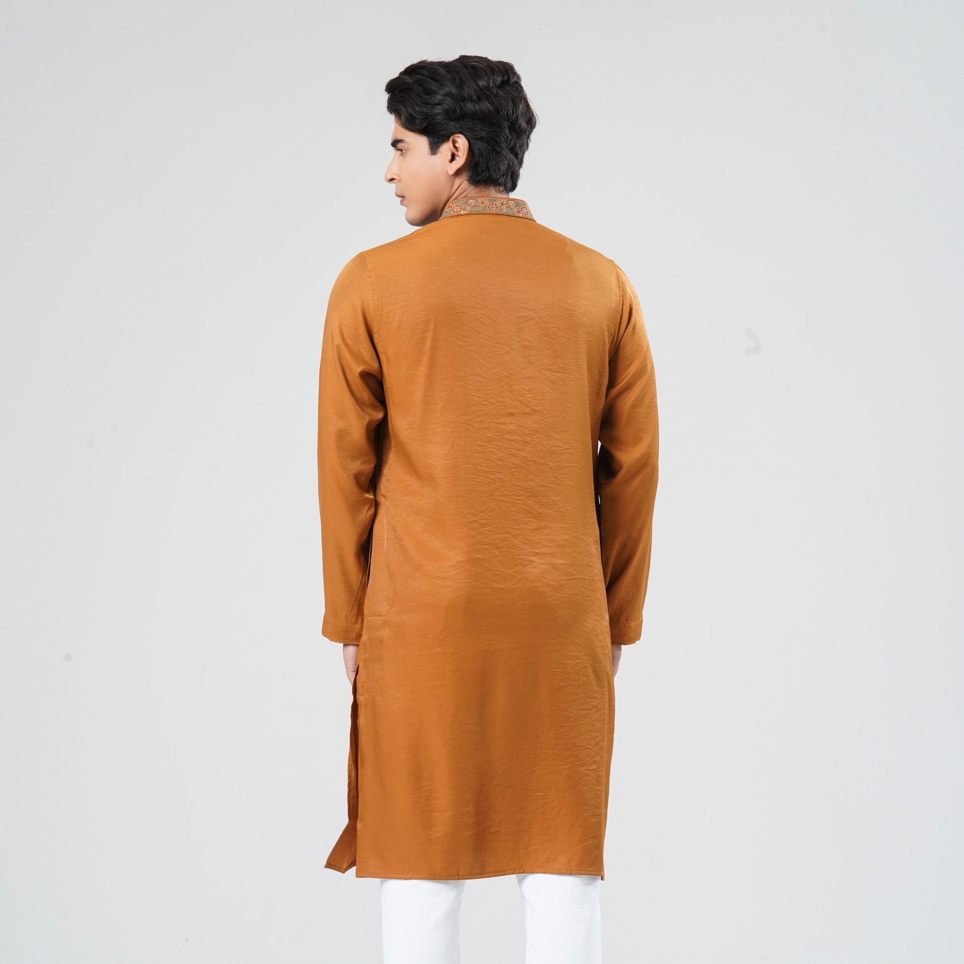 This men’s blended fabric Panjabi features floral-inspired karchupi embellishment that adds a subtle ethnic charm to its minimal design. Crafted for comfortable wear, it offers a refined and elegant look ideal for festive and traditional occasions.