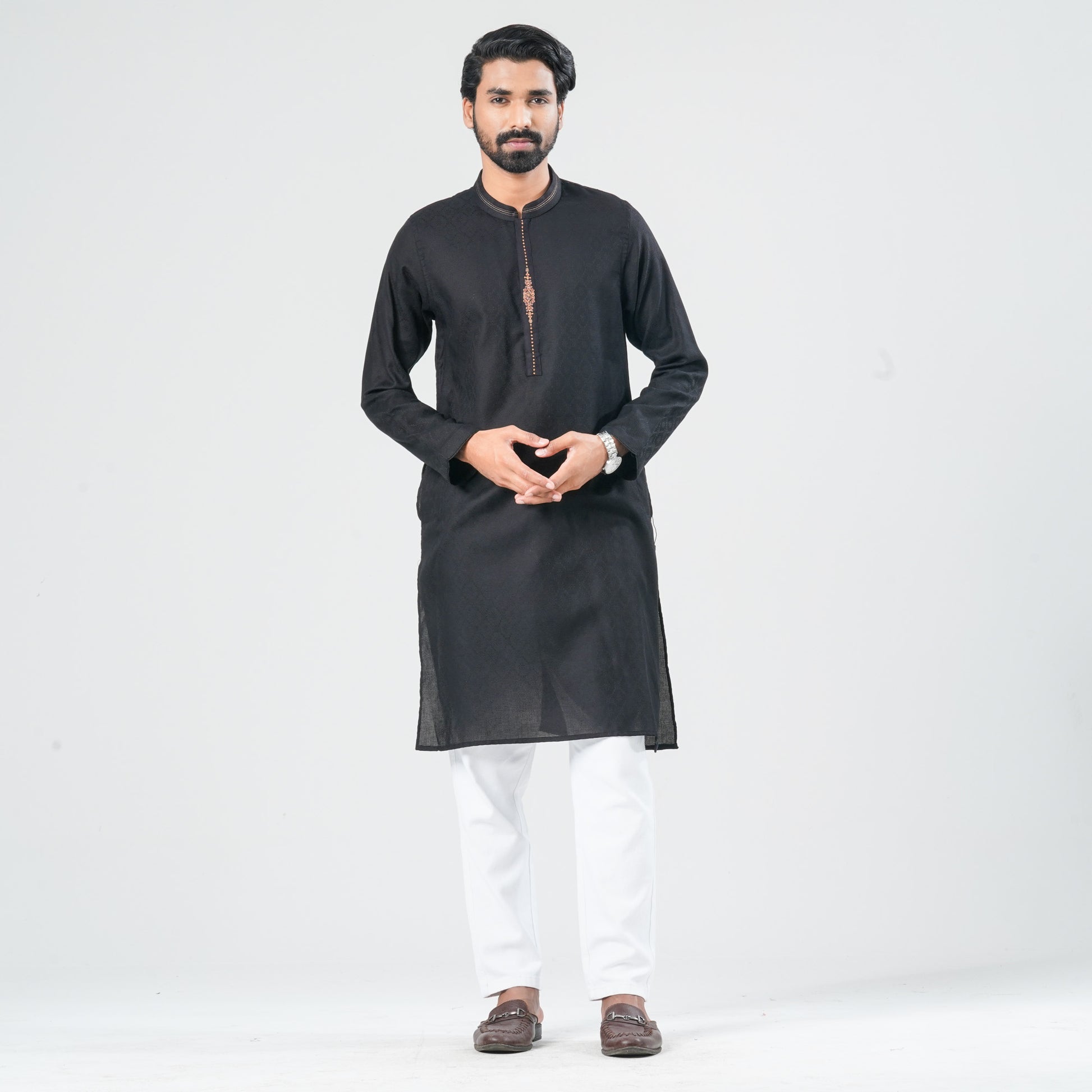 Crafted from breathable cotton fabric, this black panjabi offers a refined festive appeal. The placket is enhanced with sequin embroidery, adding a subtle yet eye-catching sparkle. Its clean ethnic silhouette delivers a polished festive ethnic look perfect for occasions and celebrations.