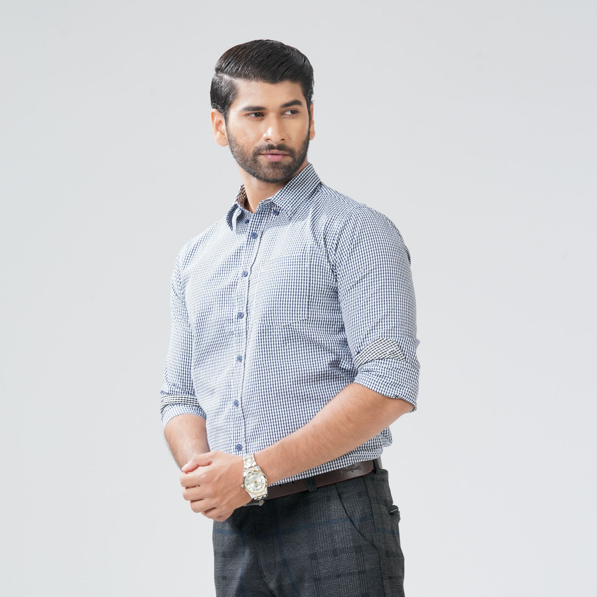 Stylish mens long-sleeve check shirt in a classic blue and white combination. Crafted from soft blended fabric for a comfortable fit and lasting wear. Designed with a versatile look, perfect for casual outings, office wear, or semi-formal occasions. A timeless wardrobe essential with modern appeal.