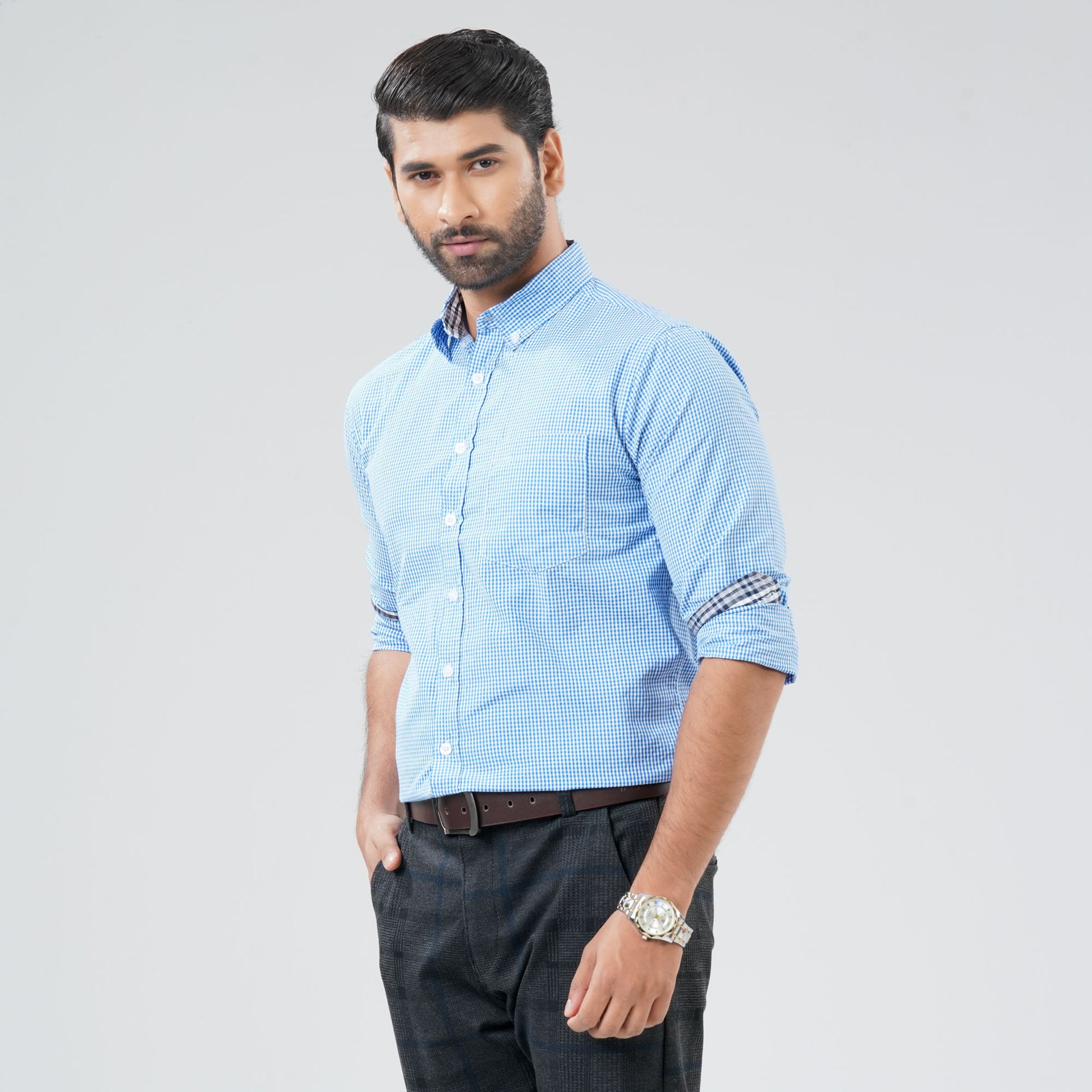 This mens light blue and white check shirt is made from cotton & poly , offering a comfortable and breathable feel. It features a button-down collar and contrast fabric at the inner cuff, adding subtle yet stylish details. The slim fit design provides a sleek and modern silhouette, ideal for both casual and semi-formal occasions.