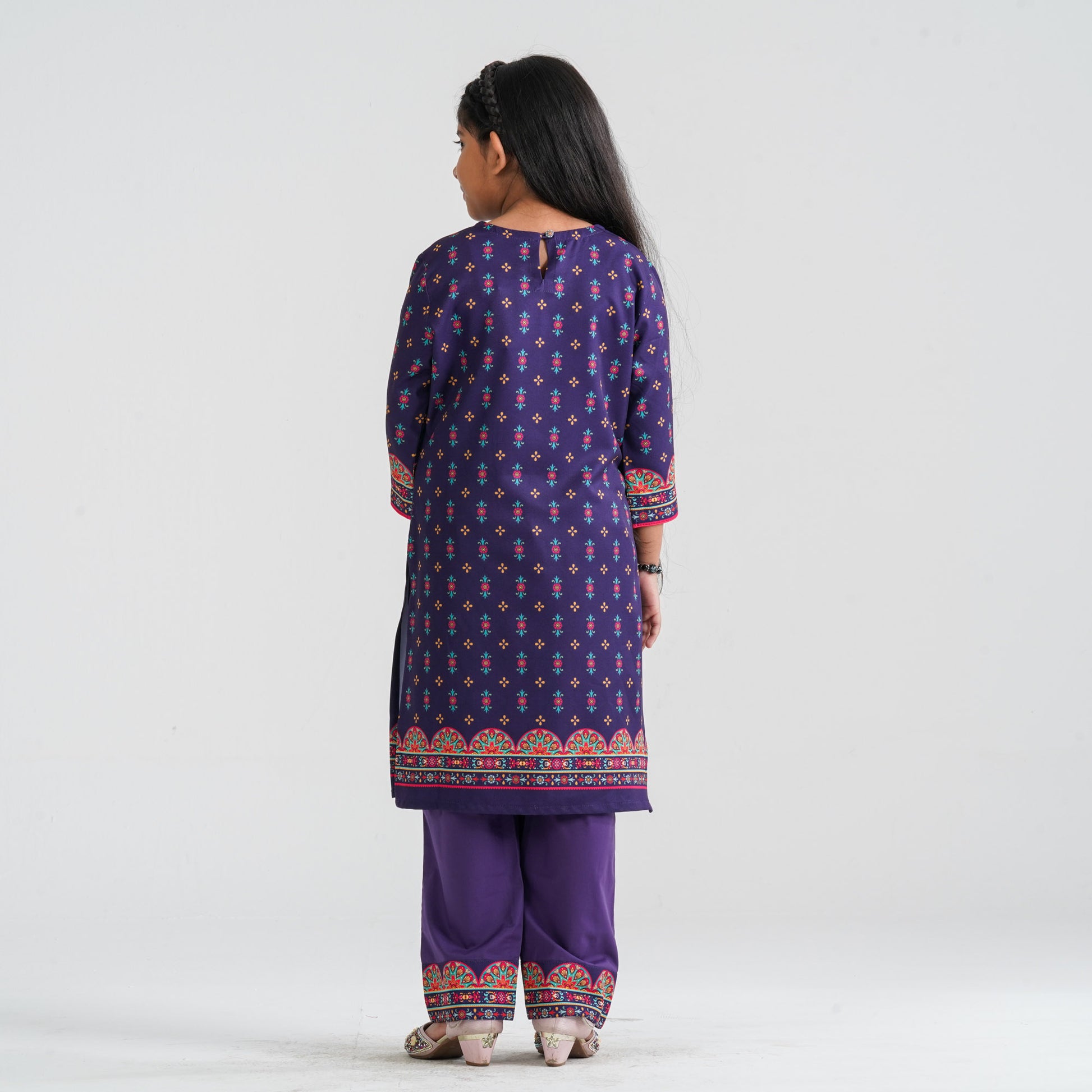 This girl’s ethnic two piece set is crafted from soft blended silk fabric, featuring elegant digital prints for a festive appeal. The straight-cut kameez is adorned with delicate sequin work, paired with a comfortable straight-fit pant. Lightweight and breathable, it ensures ease of movement and all-day comfort. Ideal for festive occasions, celebrations, and special events.