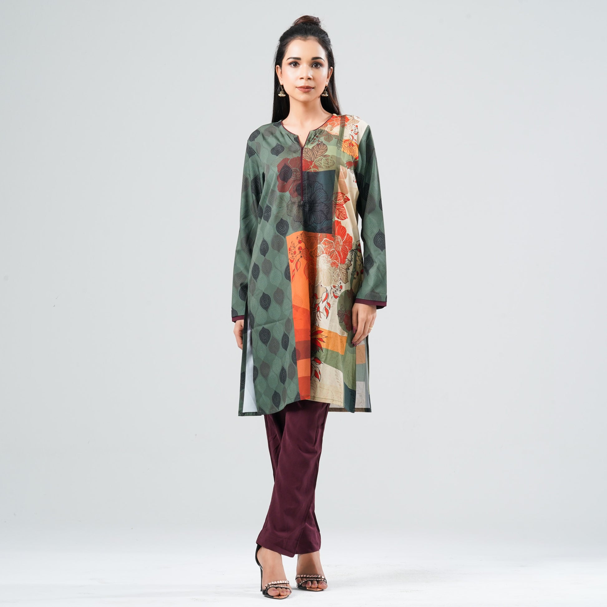 This ethnic two piece set features a round-neck kameez crafted from soft blended silk for a smooth, refined drape. The design showcases digital printing enhanced with cord-piping detailing for a clean, elevated finish. Paired with a comfortable matching bottom, it offers an elegant everyday ethnic look with a modern touch.