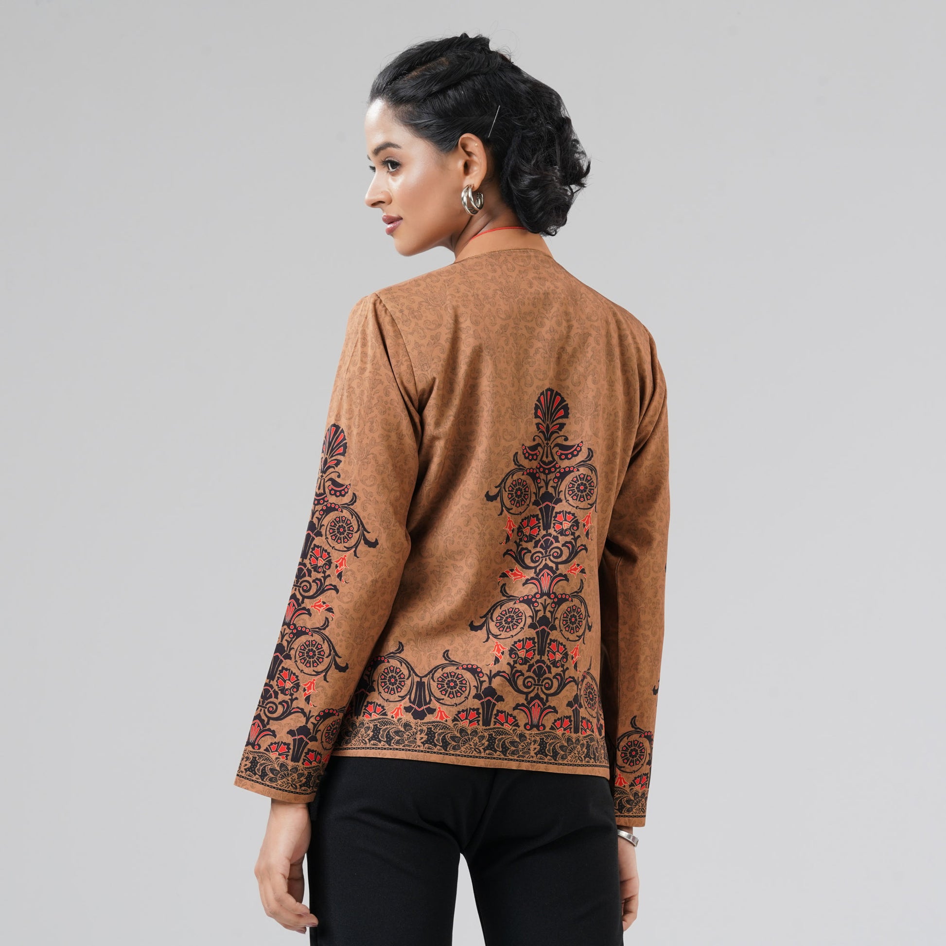 Add vibrant elegance to her wardrobe with this womens light brown ethnic jacket, featuring beautiful digital prints for a traditional yet modern look. Crafted from soft woven fabric in a regular fit, it offers both comfort and style. Perfect for pairing with ethnic or casual winter outfits.