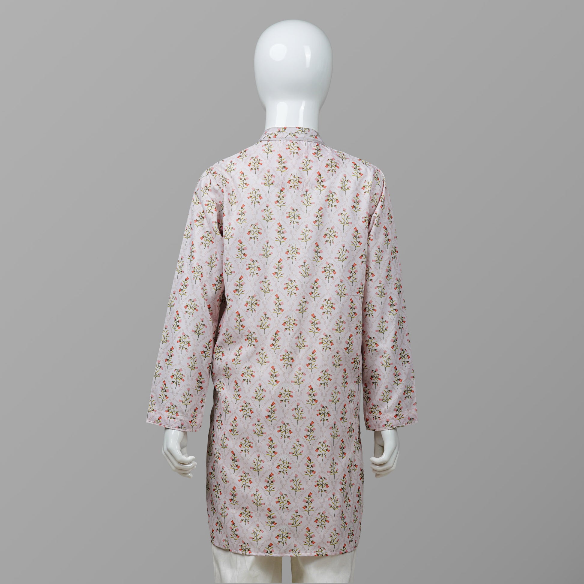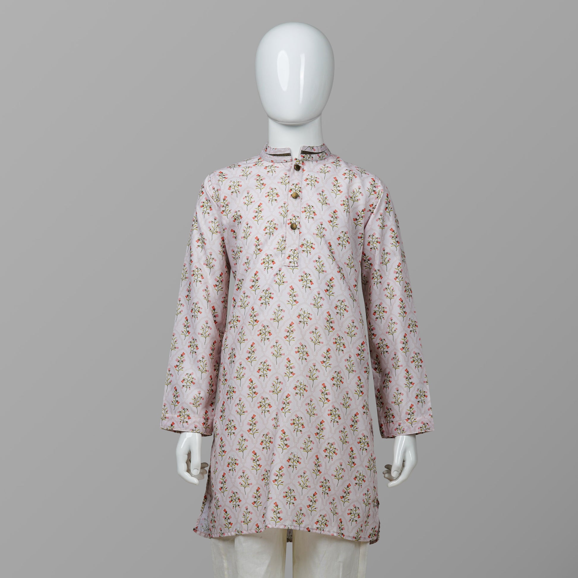 Classic off white boys panjabi made from soft mixed cotton fabric for comfort and breathability. Designed with a flower-based digital print, solid detailing, and cut & sew work on the collar. A stylish and traditional choice for festive occasions or cultural events.